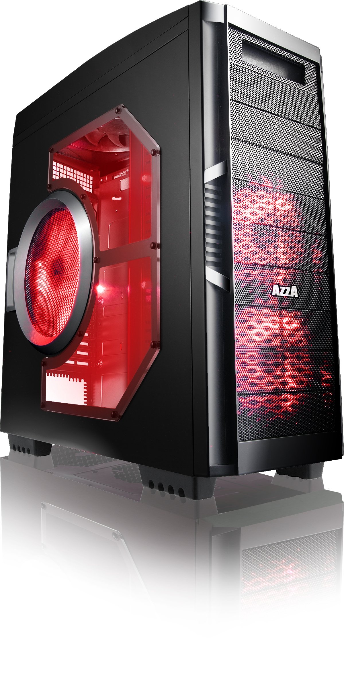 4.1. irudia: Aurrealdea view of the AZZA Solano 1000R case, showcasing the red LED fans on the front and side panel.