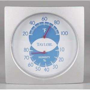 The Taylor 5504 Humidiguide & Thermometer operates mechanically and requires no batteries. Readings are displayed continuously on its clear dial.