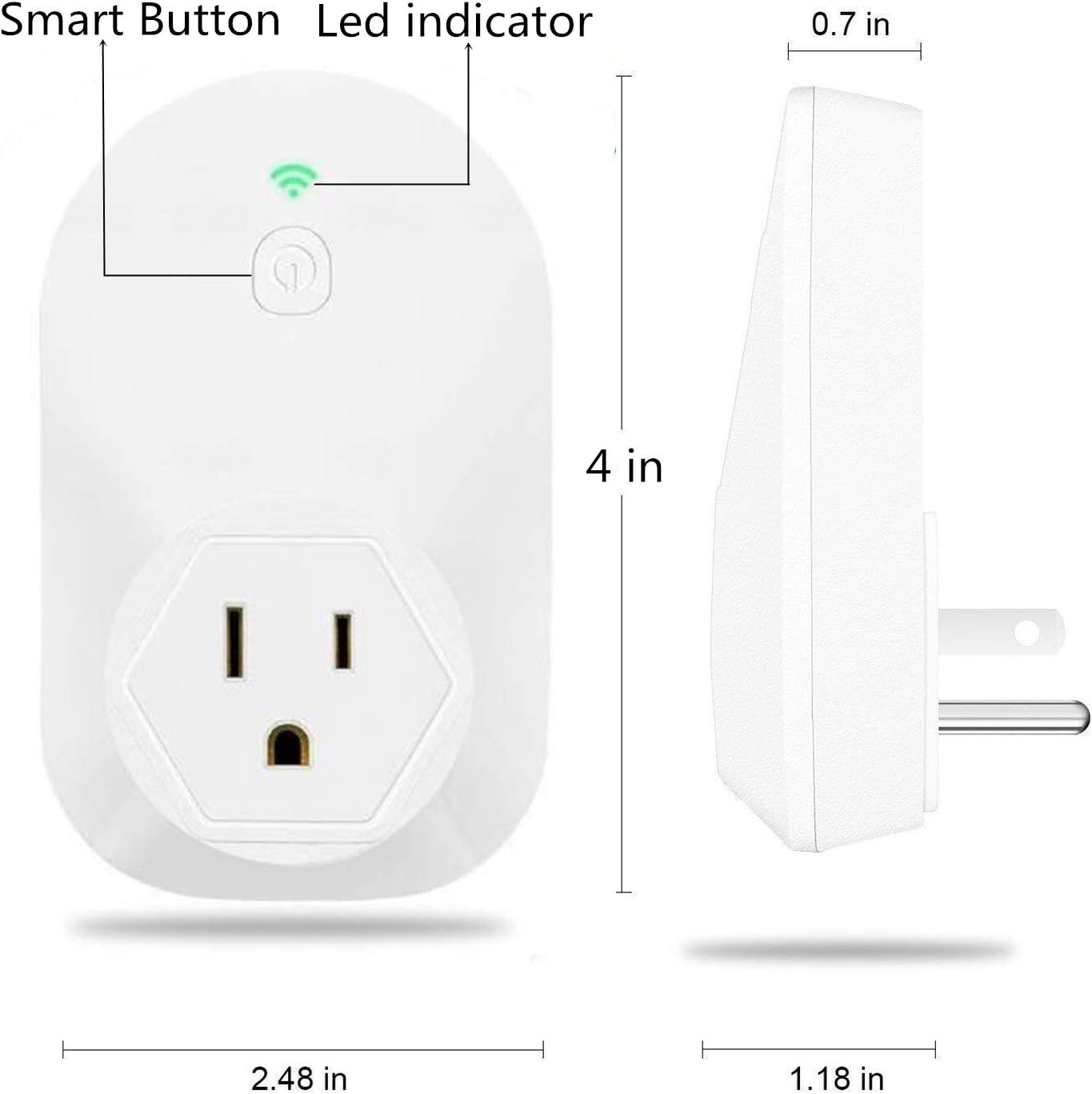 2.1. irudia: The main control unit, a white rectangular plug-in device, showing its smart button, LED indicator, and approximate dimensions (4 inches high, 2.48 inches wide, 1.18 inches deep).