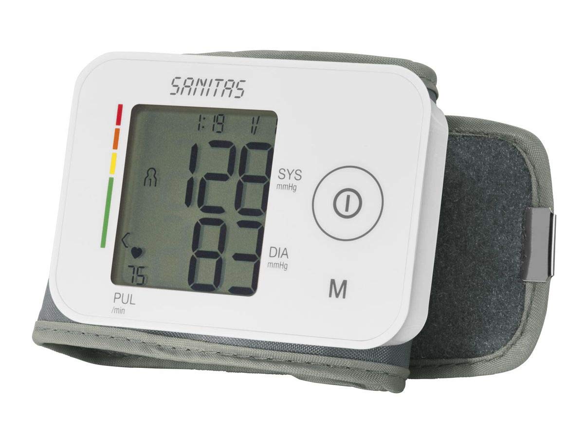 The Sanitas SBC 26 is a compact wrist blood pressure monitor. It features an LCD display for showing measurement results, date, and time. The device includes a wrist cuff suitable for circumferences from 14 to 19.5 cm.
