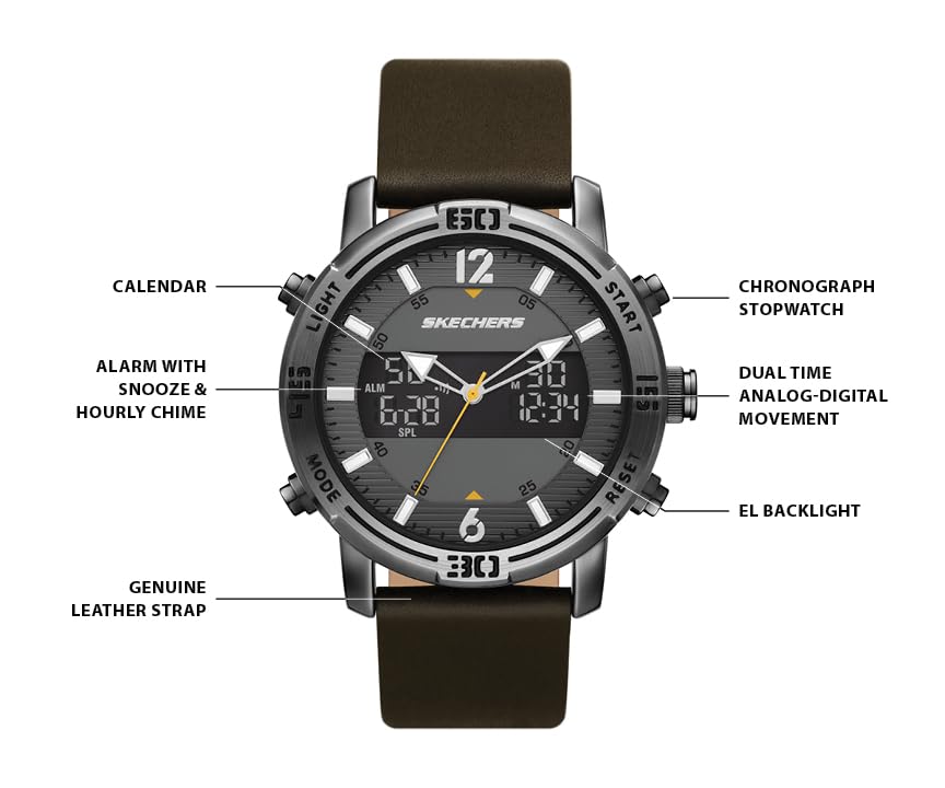 This image highlights the key features of the Skechers SR5159 watch face, including the analog-digital movement, chronograph, alarm, calendar, and EL backlight. It also points out the genuine leather strap.