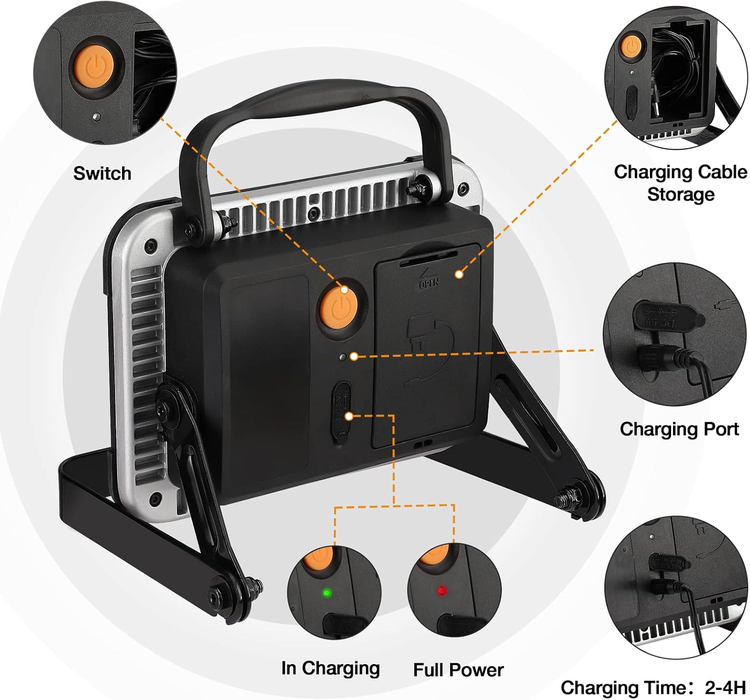 The work light features a convenient integrated compartment for storing the USB charging cable.