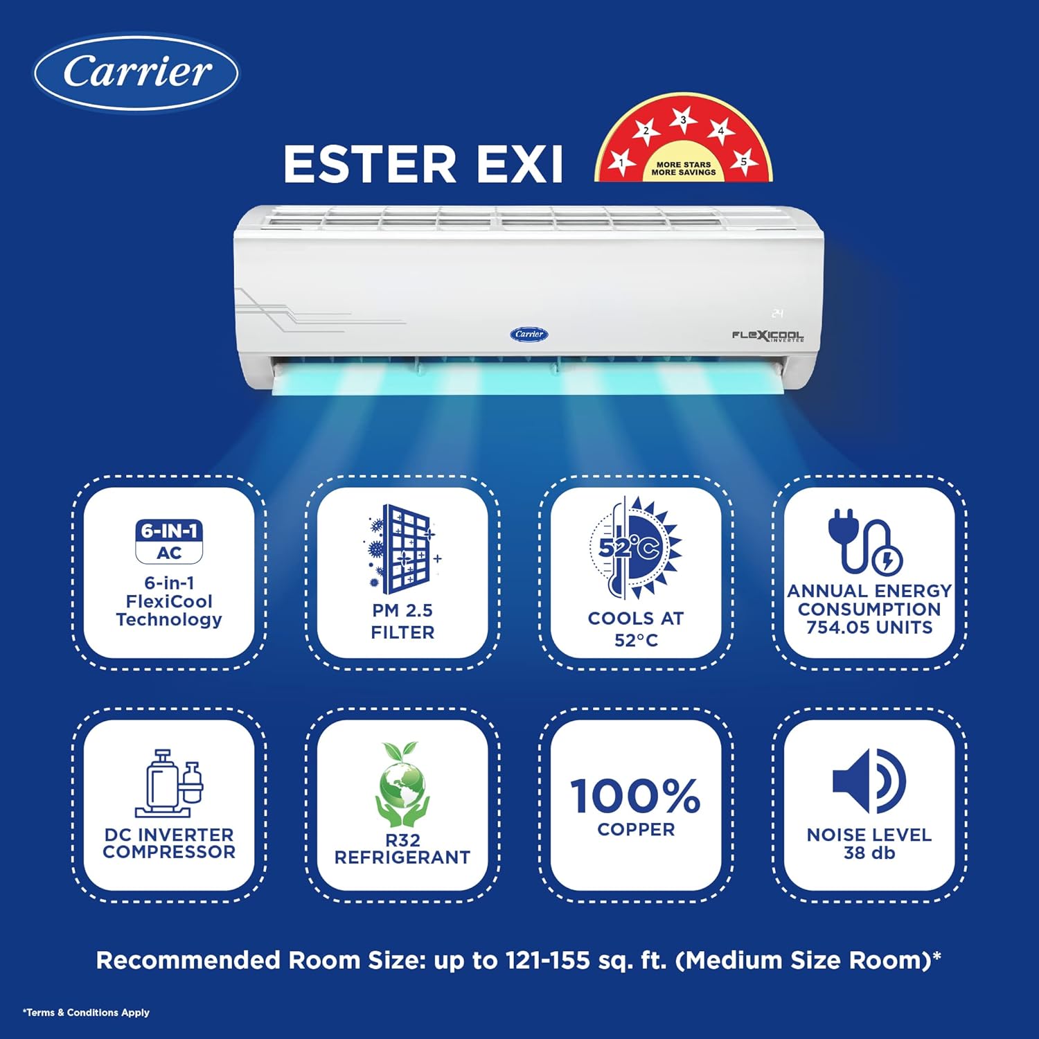 The Carrier AI Flexicool Inverter Split AC is designed to provide optimal cooling performance with advanced features such as 6-in-1 Convertible Cooling, Dual Filtration, Auto Cleanser, and Stabilizer Free Operation. It is suitable for mid-sized rooms ranging from 111 sq ft to 150 sq ft.