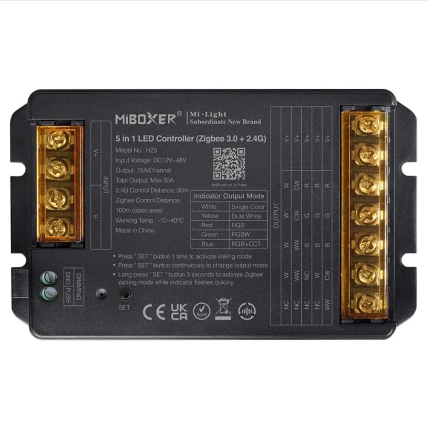 The MiBOXER HZ5 5-in-1 LED Controller is a versatile device designed for managing various LED lighting systems. It supports both Zigbee 3.0 and 2.4G wireless communication, offering flexible control for single color, dual white (CCT), RGB, RGBW, and RGB+CCT LED lights. This controller integrates seamlessly with compatible smart home systems and offers precise control over brightness, color, and color temperature.