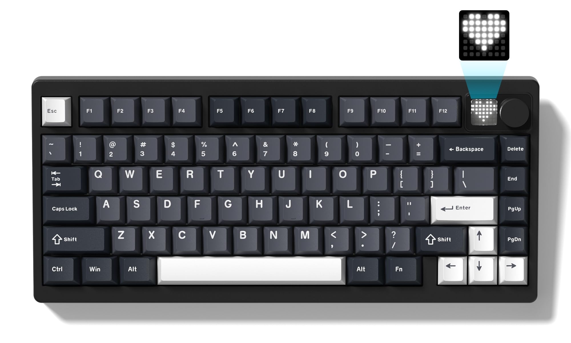 Image: A close-up of the Womier MT75's dot-matrix display, showing various customizable patterns and colors, along with the metal knob for volume control.