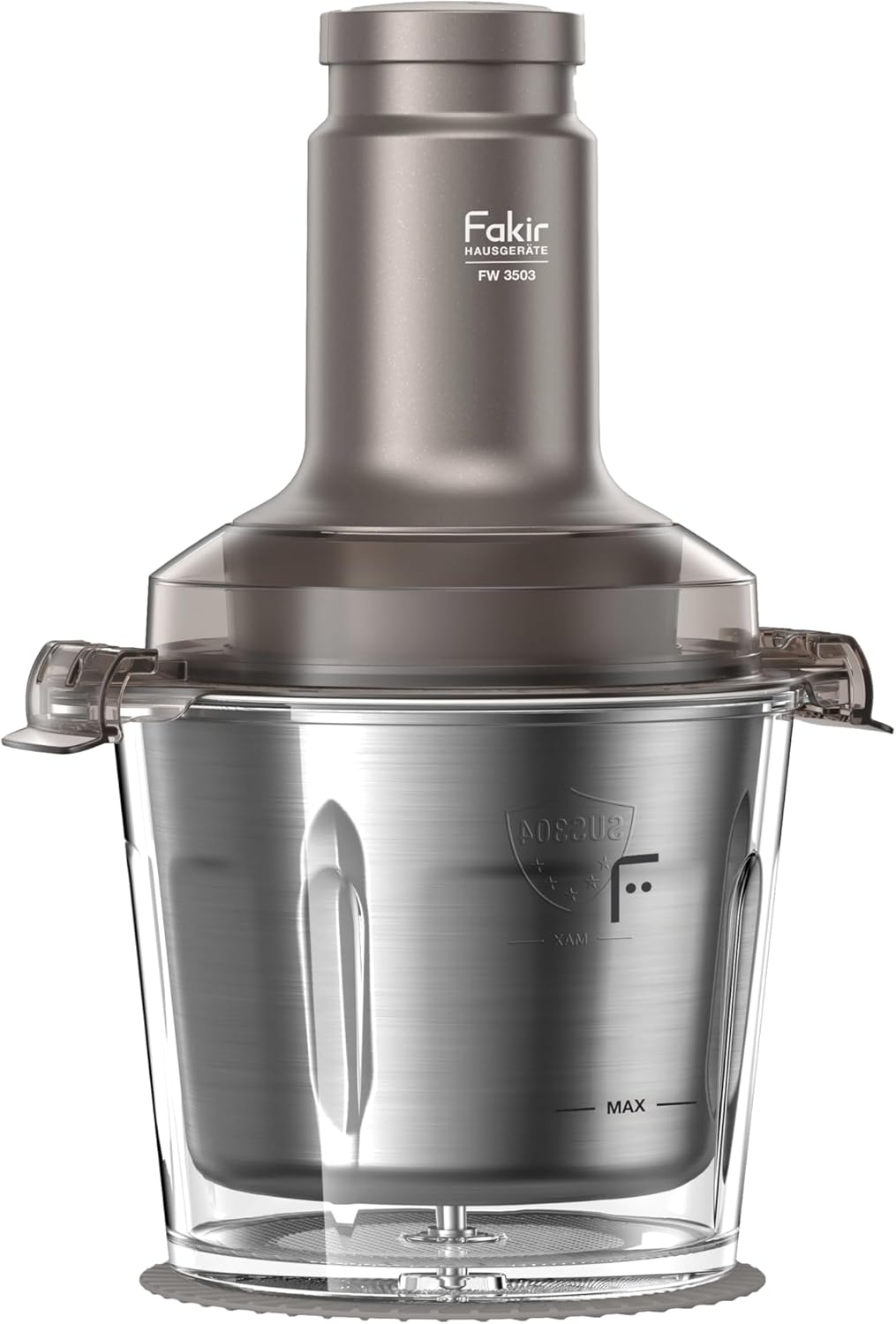 Image: The Fakir FW3503 Multifunctional Chopper, fully assembled with its clear processing bowl and motor unit.