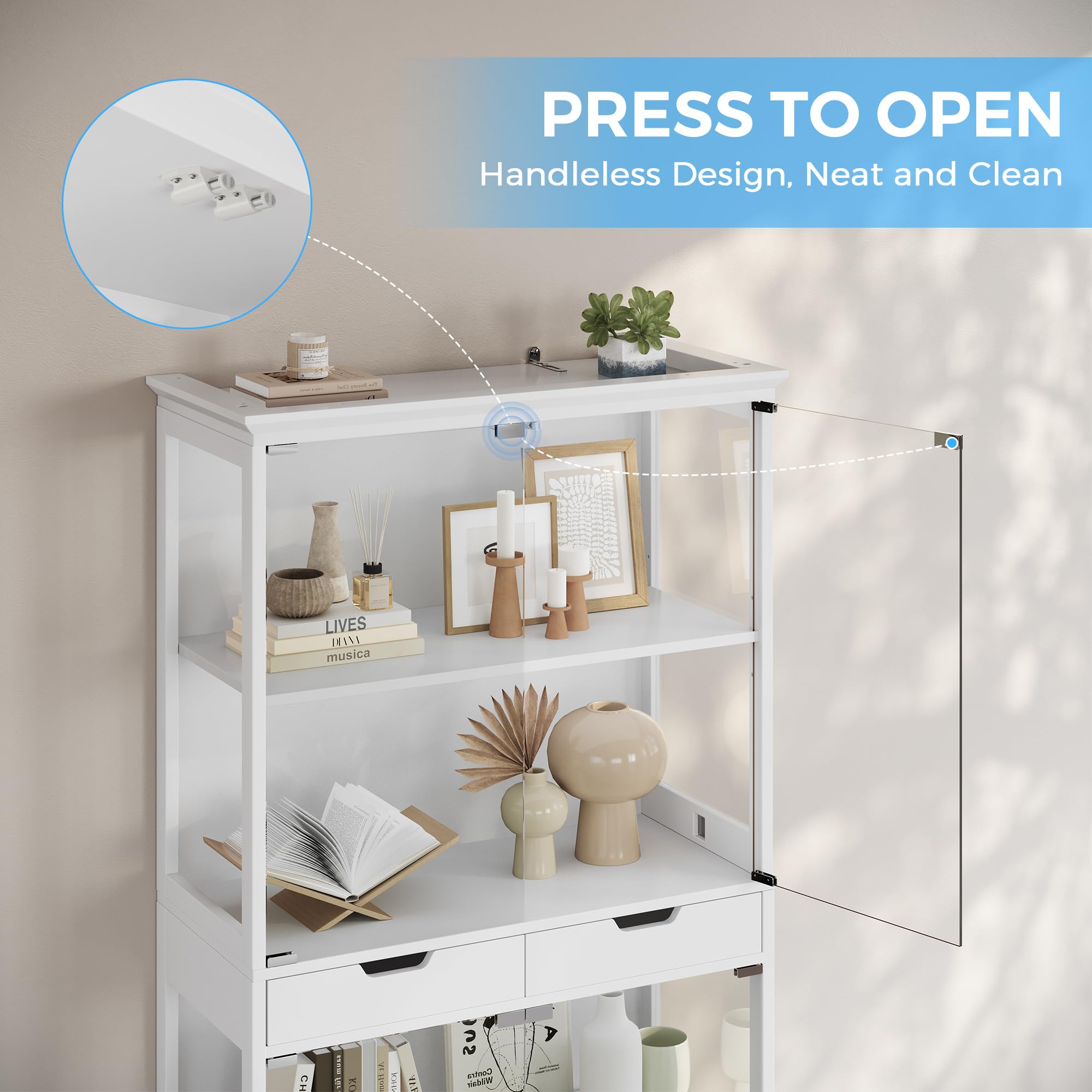 The cabinet features a handle-free push-to-open mechanism for its tempered glass doors. To open a door, gently press on the center of the door panel. The magnetic latch will release, allowing the door to swing open. To close, simply push the door shut until the magnetic latch engages.